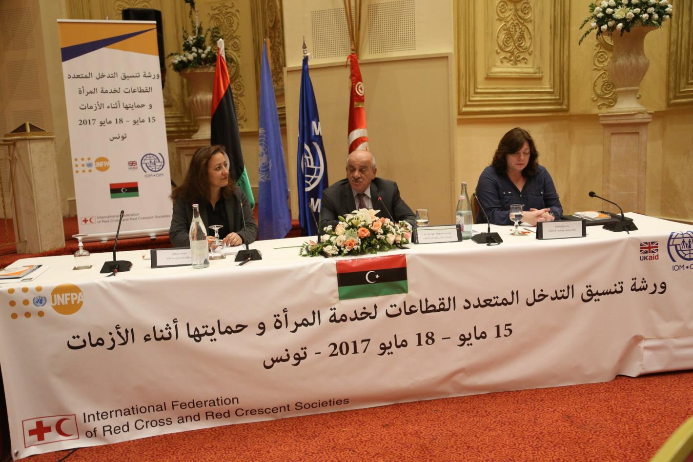 Opening Remarks of the Workshop on Multi Sectoral Coordination in LibyaFrom Left to right: Ms Maysa Khalil, Programme Officer, IOM Libya, Dr Georges Makram Georgi, UNFPA Libya Country Director, Ms.Amelia Marzal, IFRC Head of Country Cluster