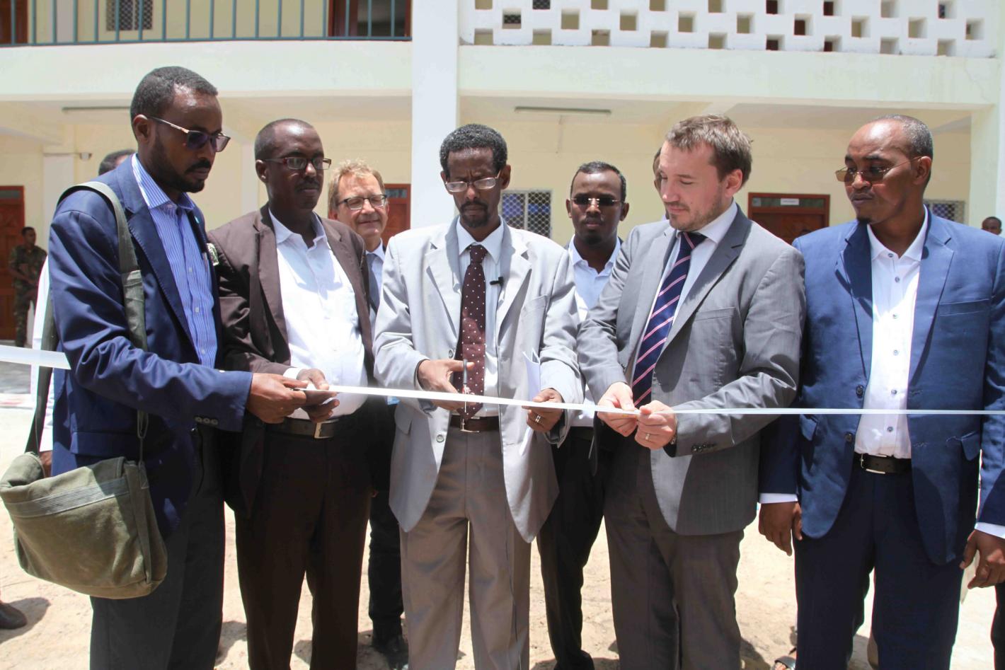 The Deputy President of Jubbaland Administration, Mohamud Sayyid Aden (middle), flanked by the German Deputy Ambassador to Somalia, Markus Bollmohr (2nd right), and the Director Rule of Law Security Institutions Group (ROLSIG), Staffan Tillander (3rd left), cuts the ribbon during the official opening of the Disarmament, Demobilisation and Reintegration (DDR) centre in Kismaayo, Somalia, on 1 March 2017. UN Photo