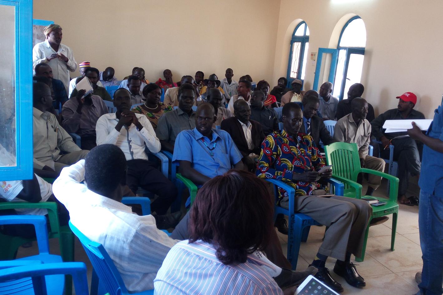 Representatives from communities in the Pariang area in an UNMISS Civil Affairs dialogue forum with members of nomadic groups from Sudan.