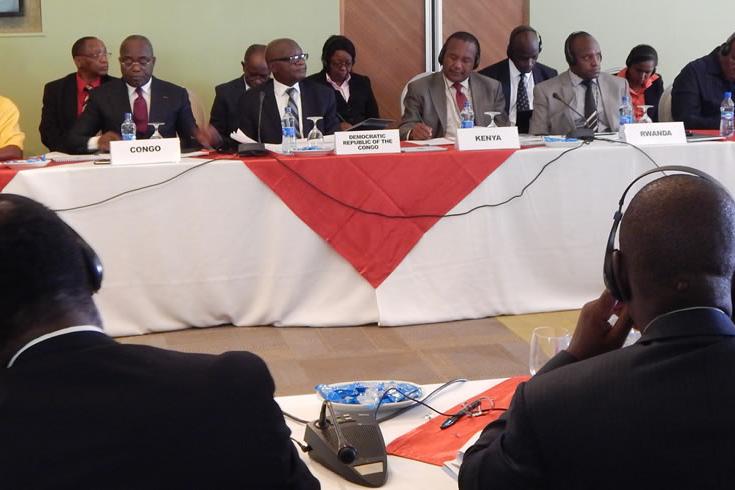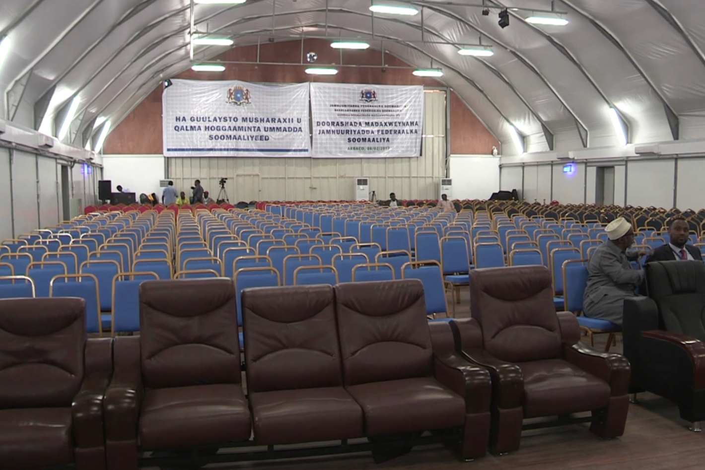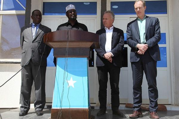 The Jubbaland State President, Ahmed Mohamed Islam Madobe, flanked by the Special Representative of the UN Secretary-General (SRSG) for Somalia, Michael Keating (2nd from left), the Special Representative of the African Union Commission Chairperson (SRCC) for Somalia, Ambassador Francisco Caetano Madeira (left), and UN Assistant Secretary-General for Human Rights, Andrew Gilmour, at a press conference in Kismaayo, Somalia, on 12 February 2017. UN Photo