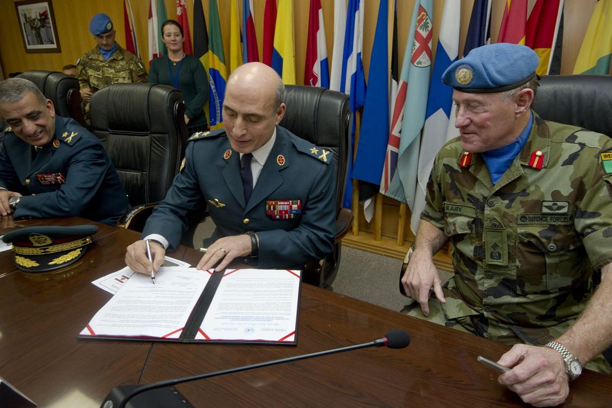 LAF Intelligence Chief (Southern region) Brigadier General Khodor Hammoud, LAF Deputy Chief of Staff Brigadier General Mohammed Janbay and UNIFIL head Major General Michael Beary sign handover documents at the ceremony to mark the donation of equipment and vehicles from UNIFIL to LAF.