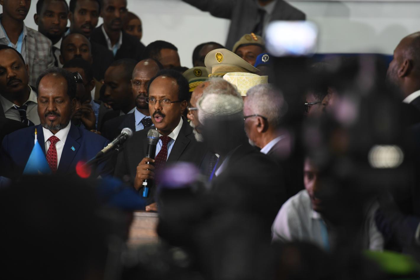 The newly elected president of Somalia, Mohamed Abdullahi Farmajo (centre) makes an acceptance speech as the outgoing president Hasan Sheikh Mohamud listens at the Mogadishu Airport on 8 February 2017. UN Photo.