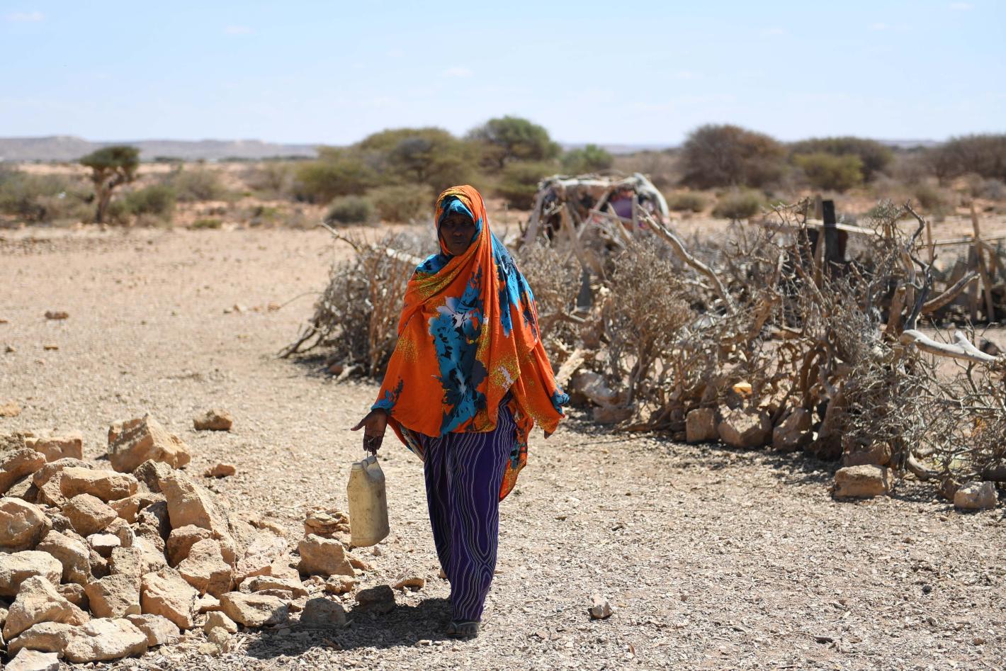 A woman walks in drought-hit Salaxley village, 15 kilometers south of Garowe in Puntland, on 1 February 2017. Puntland is one of the regions hit by a severe drought. UN Photo