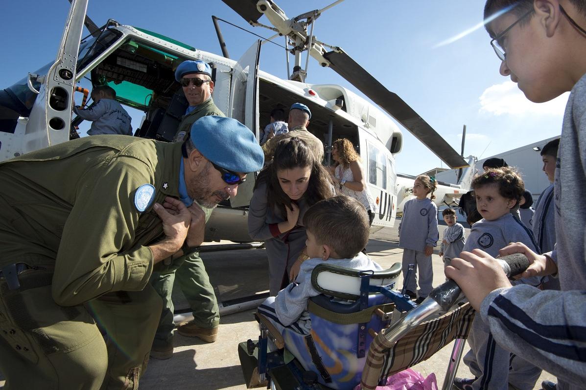 Col. Scopelliti, head of UNIFIL’s Italian Aviation team, chats with some young people who are visiting UNIFIL headquarters in Naqoura.