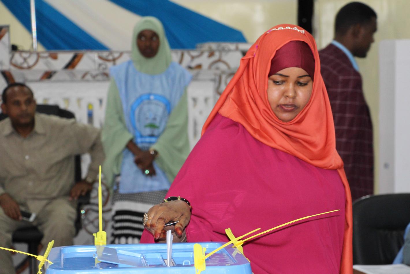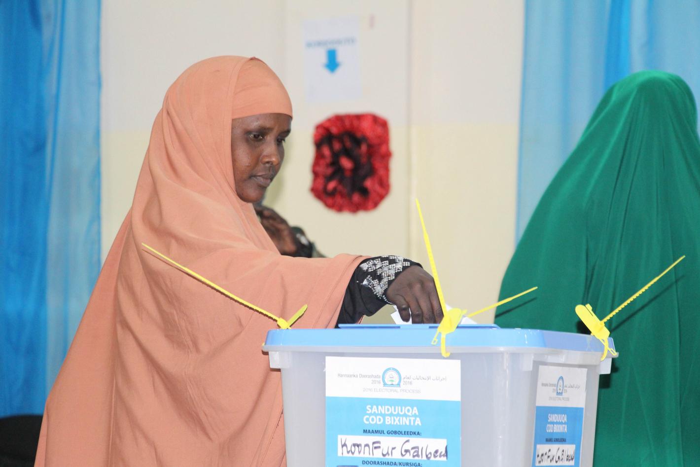 A delegate casts her vote during the electoral process to choose members of the Lower House of the Somali federal Parliament in Baidoa, Somalia on 24 November 2016. UN Photo