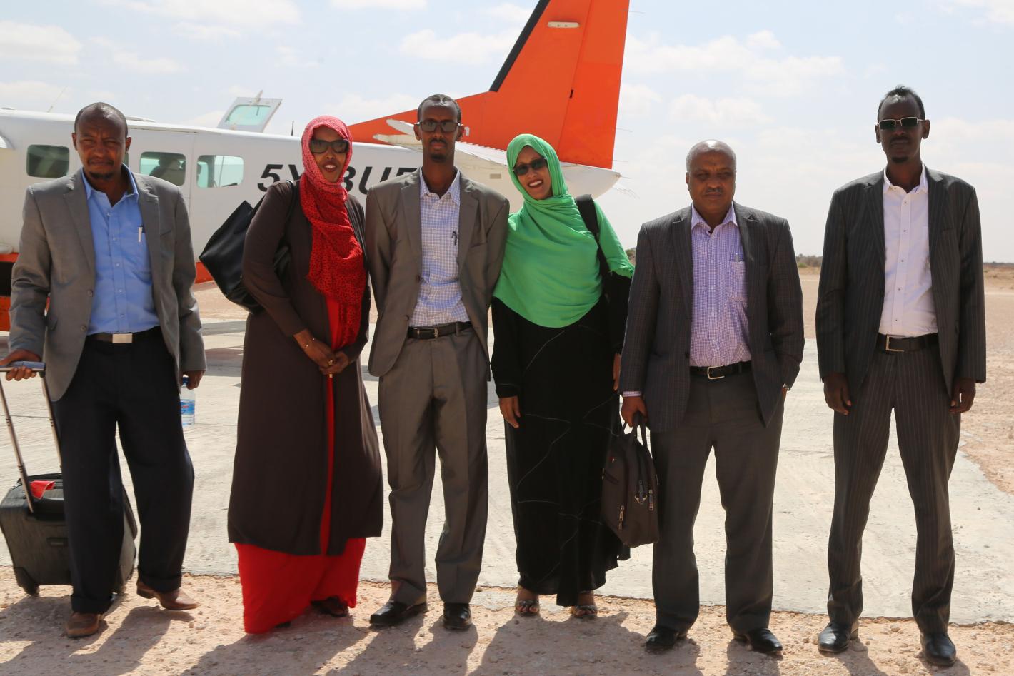 Members of the Federal Indirect Electoral Implementation Team (FIEIT) arrive in Cadaado, Galmudug State to assess progress of the on-going electoral process to choose members of the Lower House of the Somali federal Parliament on 24 November 2016. UN Photo