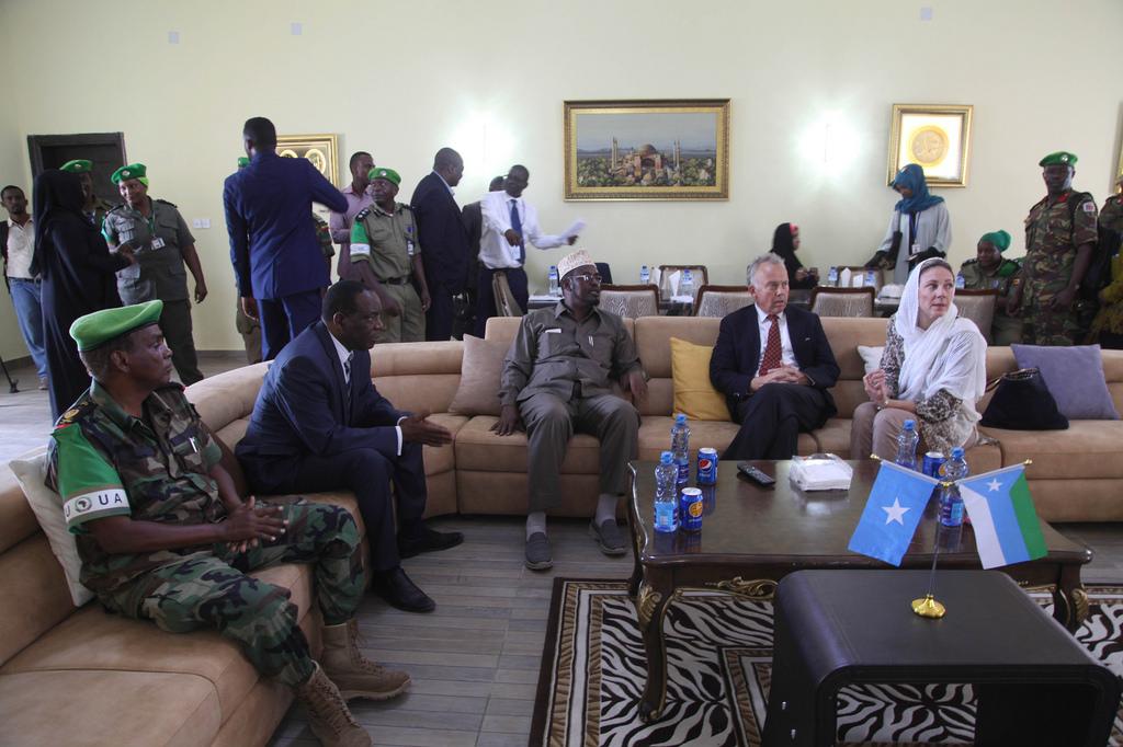 The Special Representative of the UN Secretary-General (SRSG) for Somalia, Michael Keating, the Special Representative of the African Union Commission Chairperson (SRCC) for Somalia, Ambassador Francisco Caetano Madeira, the Head of European Union Delegation to Somalia, Ms. Veronique Lorenzo and other AMISOM officials during a meeting with the Jubbaland State President, Ahmed Mohamed Islam Madobe in Kismaayo, Somalia, on 24 November 2016. UN Photo