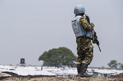 Member of integrated patrol unit standing guard at UNMISS Bentiu protection site. Photo: UNMISS/Isaac Billy