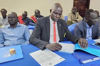 Senior representatives from the UN and the Federal Government of Somalia pose for a group photo during a handover event facilitated by UNMAS in Mogadishu
