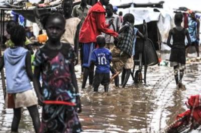 Juba displaced coping with onset of rainy season at UNMISS protection area on 13 March before moving to new site with better shelter. Photo: UNMISS/Isaac Billy