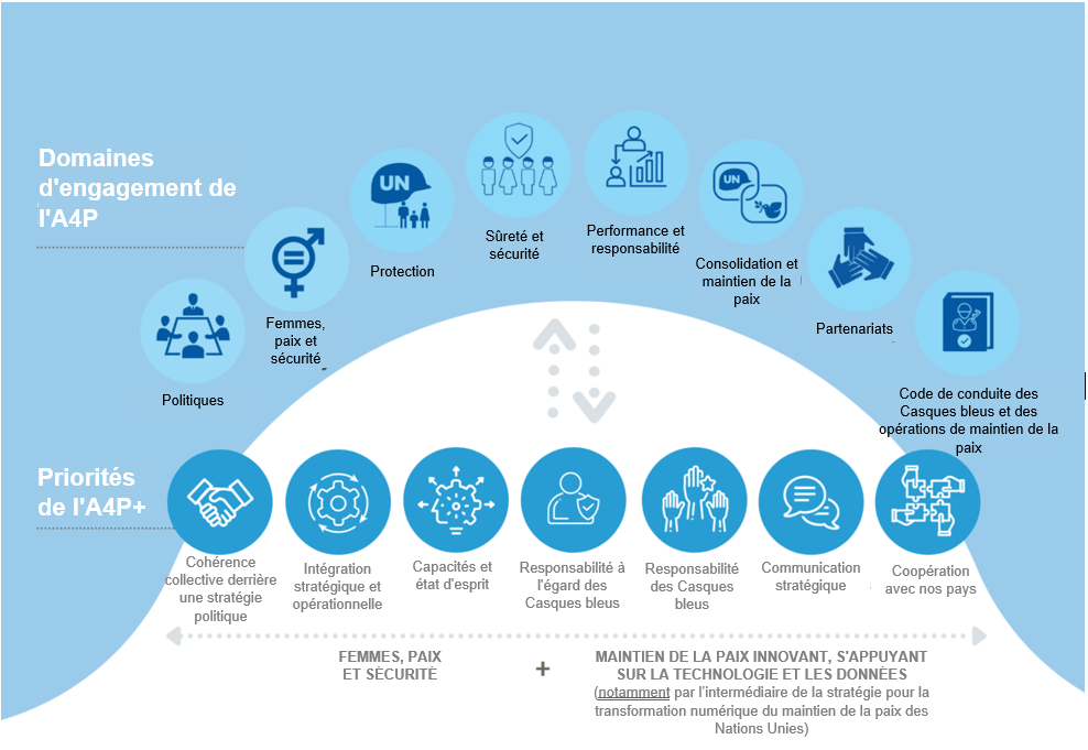 En réponse aux défis rencontrés, le Secrétaire général a annoncé en 2018 une Action pour le maintien de la paix (A4P), dont l’objectif est de renouveler l’engagement politique mutuel en faveur des opérations de maintien de la paix. Le Secrétaire général a appelé les États Membres à soutenir l’élaboration d’un ensemble de principes et d’engagements mutuellement convenus afin de créer des opérations de maintien de la paix adaptées à l’avenir. L’initiative A4P vise à recentrer le maintien de la paix sur des attentes réalistes, à renforcer les opérations de maintien de la paix et à les rendre plus sûres, et à mobiliser un soutien plus large à l’adoption de solutions politiques et à la constitution de forces bien structurées, bien équipées et bien entraînées. Des États Membres et des organisations régionales ont approuvé la Déclaration d’engagements communs relative au maintien de la paix des Nations Unies, qui contient quarante-cinq engagements dans huit domaines clés. Pour relancer l’Action pour le maintien de la paix en se concentrant sur quelques priorités systématiques et transversales, le Secrétaire général a annoncé en 2021 une Action pour le maintien de la paix Plus (A4P+), laquelle fournit une stratégie de mise en œuvre à l’appui des priorités clés de l’A4P dans sept domaines thématiques.